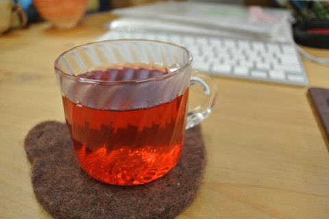 簡さんのハイビスカスティー イベントが終わって、気がつけば「ド年末」になっていた。 焦るわたくしです。 冬休みまで、風邪は引けません。 わたしは毎年、 簡さんのハイビスカスのお茶にお世話になっています。 朝いちばんで、ハイビスカス3りんと氷砂糖をタンブラーに入れ、お湯をそそぎます。 これをいちにちじゅう飲みます。 今日は、ハイビスカスを5りんにして濃いめに入れてみました。 あまみはハチミツです。おいしい〜。 ハイビスカスのお茶が入った簡さんのお茶のセットは こちらで販売しています。 (烏龍茶は売り切れてしまいました、 すみません) 2012/12/18 15:32 |