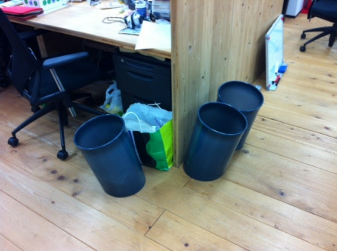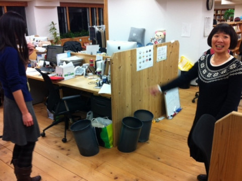 ゴミ箱不景気。 こちら、端っこの島です。 実はゴミ箱に困っています。 背後にはミネラルウォーターのボトルがたくさん置いてある。 スガノの席のうしろのゴミ箱を3人で使っています。 ちょっと不便です。 いちいち立ち上がらなくちゃならないのでね。 という話をスガノとしていたら、 「ええええええええええええええええ!」 とびっくり仰天スガノ。 「なにこれー!」 え、なになに? 「ここ見てよ!」 ええええええええええ! わたしたちはこんなにゴミ箱で困っているのに、ここには、2個並んで! わ、と思ったらもう1個。 3個もあるでないかい。 見てよ、チューヤ! ( 「ほんとだ、しかも、 ぜんぜん捨てられてないですね」 どひー! ほんとだー! 贅沢すぎるよ! ゴミ箱バブルだ。 んもうっ、ちょっと、もらっていきますからね。 というわけで、わたしとたまこの間にゴミ箱がひとつ設置されました。 はあよかった。 2012年のうちにこれができてよかったな。 2012/12/26 20:25 |