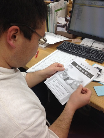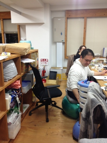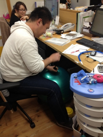 イサワのイス 今日の午後のこと。 なになにー?と寄ってみると、なんだか、座っているものがいつもと違う。 ヨガボールを買ったのだそうです。 思ったよりサイズが小さく、デスクまでの距離が遠かったようですが、そこは、クッションを足して、なんとかカバー。 となりの ‥‥その数時間後‥‥ 「ぴひょろろろろろ〜!! ぽひょよよよよよ〜!!」 と、激しいリコーダーのような音がするので、びっくりして振り向くと、やっぱり(?)、音の主はイサワでした。 でも、笛を吹いているのではなくヨガボールの空気が抜けた音だったようです。 またしても、みんなからの注目を集める楽しいイサワなのでした。 イサワさん、フィットネス、がんばってください〜。 2013/01/21 19:08 |