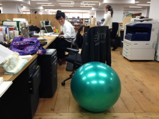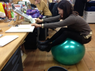 のイスが壁際に放置されていたので戻してあげようと思ったら、ヨガボールに座ってクールに仕事する