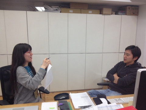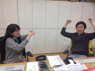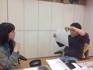 ふたりで資料確認 向かいの席の のわりには、紙との距離が遠い気がします。 「じゃ、ここは?」 「静岡‥‥いや、新潟だな!」 「正解! 西田さん、視力2.0でしたっけ?」 えーっ、視力検査!!? ‥‥ではないですが、エクセル表の確認の合間に、これ、読める?とクイズを出し合うふたりなのでした。 それにしても、西田はほんとうに目がいいと思います。 4枚めの写真は、西田の脇に座って撮ってみましたが、わたしには、この距離ではまったく文字が認識できませんでした‥‥。 2013/02/05 13:23 |