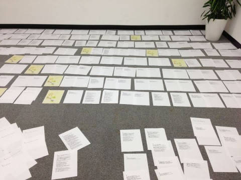 できていく本。 並べ替えたり、つけ足したりしながら、だんだんと、本ができていきます。 深夜にひとりでこういうことをしていると、 「ああ、こういう本なのか」と他人事のように、その本がわかってきます。 どうやら、今年出す、7冊めの「小さいことば」シリーズ、『ぽてんしゃる。』は、さまざまな感情を内包しつつも、細い糸がピーンと張り詰めるような感じで 「かなしみ」がひとつの軸になっているようです。 いえ、夜中にひとりで吹き出すようなたまらないフレーズもあちこちに散りばめられているんですけどね。 さて、もうひとがんばり。 それにしてもこうして写真を撮りながら気づいたけど、部屋の角の観葉植物は片づけてから作業すればよかったんじゃないか、オレ? 2013/04/16 03:26 |