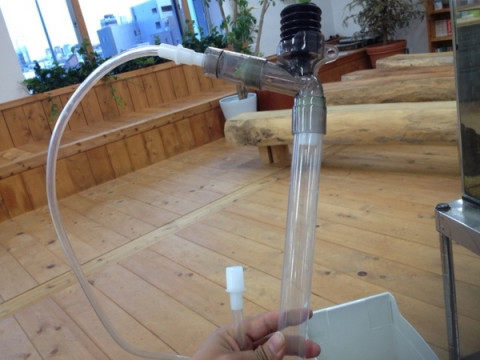 ふぐさんのお掃除 ゴールデンウイークといえども今日は木曜日です! 木曜日には大きな仕事がまっています! フグさんの水槽掃除です。 フグさんが水槽掃除をするのではなく、フグさんの水槽をぼくが掃除します。 ぼくは最近、自分の部屋の掃除もできていません。 なのにフグは、、、 「自分で掃除したらどうなんだ!」 と、言いたいところですが、フグさんに癒されているお礼だと思って、感謝を込めて掃除しております! この写真の掃除道具。すごいんです! 黒いポンプみたいなところを何回か押しますと、水が吸い上げられて、バケツに移すことができます。 電気も使わずに。体力も使わずに。 これ、重力に逆らってるんですよ! この道具は重宝です。 というわけで、今日もがんばります! まさか掃除しているときにフグ刺しが食べたいなんて思いませんよ! 心から愛してますから!!! 2013/05/02 18:17 |