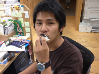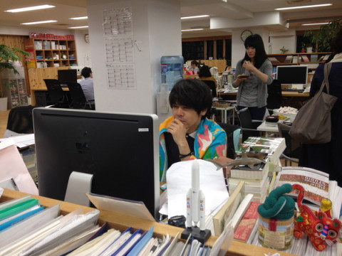 フライデーナイト めずらしい半袖姿で過ごしていた ど派手な、何かブランケット的なものにくるまれて、PCと向き合っておられました。 しかし、それ、すごい柄ですね。 「いやぁ、さむくてさ…」 そりゃそうでしょ。 まだ5月でしょ。 しかもこの席エアコンの直下じゃないですか。 「俺、ふだんは夏場もほとんど半袖着ないんだけどね…」 あ、そうなんですか。 初夏の陽気に浮き足立って油断しちゃったのね。 分かります。 「…さむい…」 むむ、だいじょうぶですか。 風邪ひいちゃだめですよ。 いまおっくんいないとほんと大変なんですから。 ちなみに、そんな梱包男子の向こう側では、風邪なんて金輪際縁がなさそうな半袖ヤングマン・JPがおにぎりにぱくついておりました。 戦士のつかの間の休息、 「ほわーん」とした顔にいやされつつ、もうちょいがんばろうっと。 それではみなさま、素敵なウィークエンドを〜! 2013/05/17 19:34 |