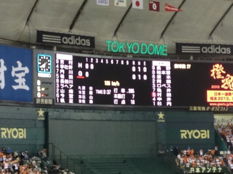 ただいま観戦中! 東京ドームにつきましたー! 「ゴーゴー レッツゴー!」 みたいな応援がすごいです! わたしは今日、手帳のページにあるダウンロードシティの 「スコアボード風メモ」を貼り付けて、やる気満々でまいりました! さっそく、書き始めることにします! …あれ、選手名って、どうやって書くんでしょう。 このメモは1から順に書いてあるけど、実際のスコアボードは守備の番号になってるからから、数字がバラバラだ!! うーん、とりあえず、スコアボードを写真にとっておくことにします。 2013/05/28 18:41 |