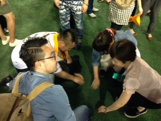 わあ、人工芝だ、毛足は…と、盛り上がっております。