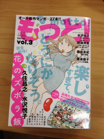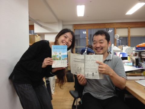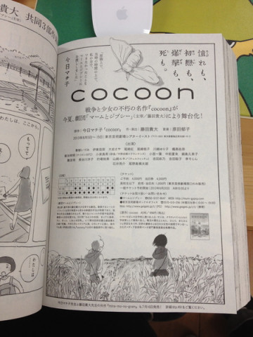 はじまります! 先週、彗星のようにプロローグがはじまった、 「今日マチ子の稽古場日誌」。 今日さんのマンガ『cocoon』が 「マームとジプシー」という演劇団体で舞台化されることとなり、今日さんがそのようすを絵日記にして 「ほぼ日」で連載してもらうことになりました。 25日(火)からはじまる予定ですので、どうぞ、たのしみにしていてくださーい! その連載に先立ちまして、舞台『cocoon』のチケットが、明日20日、午前10時より販売されます! 先行発売はすぐに売り切れたそうなので、興味のあるかたは、早めにチェックしてみてください。 くわしくは、こちらの 「マームとジプシー」のホームページをご覧くださいね。 1枚目の写真で 「もっと!」。 今日さんと 「マームとジプシー」の主宰で劇作家の藤田貴大さんの共作、 「mina-mo-no-gram」が掲載されていて、舞台『cocoon』のことがのっていましたので、べっかむ3に持ってもらいました。 ダンディーなべっかむ3に女性マンガ雑誌は、なかなかの違和感でした。 「mina-mo-no-gram」は こちらのページから36ページも試し読みができます。 太っ腹だー! 2013/06/19 18:31 |