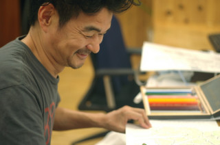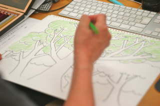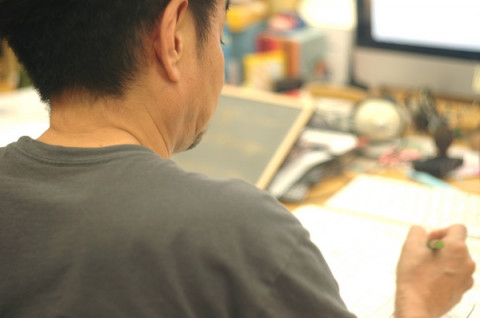 たのしそーっ 「お絵描き中」でございました。 私はチームの一員なので、この絵が何を表すのかはわかっているんですけども、みなさんにきちんとお知らせできるのはもうちょっと先になりそうです。 でも、その日をめざしてがんばります。 たのしそうに絵を描いているヒロセを見て、ちょっと思ったんですけれども。 ヒロセと、私と、ほかの乗組員と、この仕事の「よろこび」の部分はたぶん別なんです。 ちがうところで、それぞれのたのしさを感じているのです。 「同じ目的に向って進む」 というばかりでなく、別のところで、その人なりのうれしさを自然発生的に抱え、それをわかり合って仕事を進めていけるのはなんだかいいなぁ、と思います。 2013/06/24 19:12 |