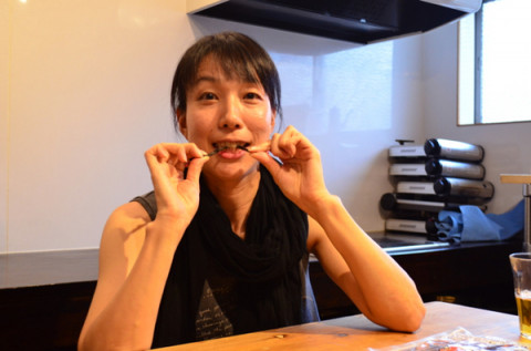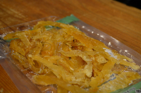 その3 久々にやってまいりました 「珍味研究ゼミナール」。 もう3回めになります。 今回は、なんと珍味3本立て。 北海道、福岡、タイランドからおこしの珍味ちゃんたち。 まずは‥‥。 前回のゼミ中に私、千歳空港にお店をもつ佐藤水産の珍味について、おおいに語ったあとで、 (またの通り名を 「おとぼけジャイアンツ」という) 北海道出張の機会をえて、千歳空港で佐藤水産に突入! 3つをピックアップ。 一つ目は「道南ふぶき」。 たらですね。白身の魚のあっさり珍味。 もう一つが、「いかすみさきいか」。 最後が「勝つとばせ!!」、鮭とばですね。 このまんなかの 「いかすみさきいか」。 なかなか手をだしにくい珍品。 トミタいわく 「ゼミのみんなが食べてくれるから 万が一アウトでも大丈夫とおもって 思い切って買ってきた。」 とのこと。 これが、大当たり。 さきイカ特有の後味のイカ味がイカスミのおかげなのかまったくなく、さらに、イカスミによって、 「アミノ味」が増している! こりゃ、鉄板の珍味! もちろん、上品なたらの「道南ふぶき」も安定のさけとばもたいへんおいしいものでした。 もぐもぐもぐもぐ。 長くなってしまったので、福岡とタイランドの珍味はまた次回! って、2回連載するようなものか? 珍味研究ゼミナール! 2013/07/11 19:36 |