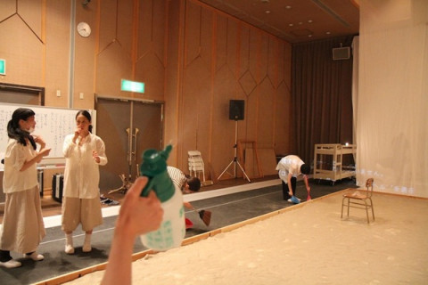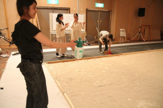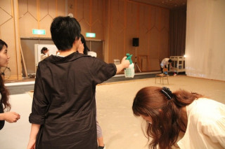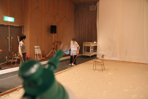 シュッシュッ マームとジプシー・制作担当の林さんが、砂に向かってなにやら「シュッシュッ」とまいていました。 おおたか 「林さん、それはなんですか?」 林さん 「水をね、まいているんです」 おおたか 「水を?」 林さん 「そうです。 ほこりを押さえるためと、 すごく乾燥してくるので、 保湿です」 おおたか 「へぇー。 そういうケアも必要なんですねぇ」 林さん 「まいてみます?」 おおたか 「はい、やってみたいです!」 ということで、水をまきました。 取っての部分についているボタンを押すと、シューーーと水が出てきて、あんがい楽しいです。 意外に、飛距離があります。 高村、もっと水にピントを!とリクエストしたのですが、何回かトライしたあと、 「これが高村の限界です」と宣言されてしました。 それなら、しゃーない。 2013/07/27 21:35 |