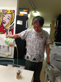そぶちゃん 祖父江慎さんの事務所コズフィッシュに行ってまいりました。 道中とても暑く、ふぅふぅ言いつつお伺いしたので、祖父江さんがつめたいお茶をいれてくださいました。 あまりこぼれなくて、すごいと思いました。 今回は本の入稿などではなくある資料を探すためにうかがったのですが、 (それは、祖父江さんが31歳のときの お仕事の記録です) とても、たのしかったです。 デザインの作業机にペーパーセメントと並んで殺虫剤が置かれていました。 糊をまこうとしてキンチョールしちゃうことはないんだろうか? と思いましたが、そういうことも、ここコズフィッシュではふつうの出来事なのでしょう。 以上、おひさしぶりの 「夏のそぶちゃん」でございました! 2013/08/19 16:44 |