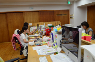 宇宙部とお客様係のメンバーが画面を見つめているところ。