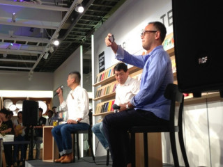 『暮しの手帖』編集長の松浦弥太郎さんと『BRUTUS』編集長の西田善太さんと糸井重里が壇上へ。