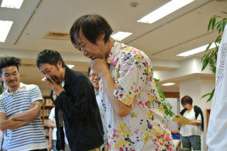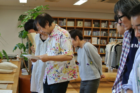原稿を見るそぶちゃん グラフィックデザイナーのそぶちゃんこと祖父江慎さんがいらっしゃいました。 いま、いっしょに、ながいことかけて一冊の本をつくっているのです。 今日は、その原稿がそろった日です。 祖父江さんは、その原稿を見においでになった、というわけです。 やぁ〜、その原稿がすばらしくて、ですね、そぶちゃんも 「わたくし、がんばらなくては!!」 とおっしゃっていましたよ。 「この本をつくる方法は、みっつあるね!」 とも、おっしゃいました。 どういう本にするのか、よーく考えて方法を決めていきたいと思います。 この冬の完成めざして、がんばりまーす! 2013/09/18 20:28 |