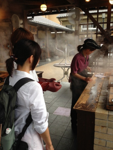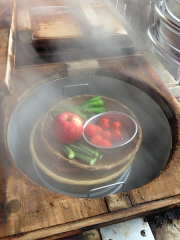 あまりにも湯けむりにうしろがみを引かれまして、われわれ大分出張組、飛行機が飛び立つまでのわずかなすきまに野菜を地獄むししました。