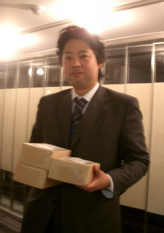 束見本ができた! 「こんばんは〜。」 すっかりおなじみになりました、凸版印刷の藤井さんが、雨の中、小包をもってやってきました。 こ、これは『TVウォッチャーの逆襲』の束見本! 束見本、あまり聞きなれない言葉ですが、 「つかみほん」と発音いたします。 本の厚みのことを「束(つか)」といって、ある程度デザインが固まってくると、実際に使う紙を本のページ数に合わせて製本していただいて、束見本を作るのです。 束見本を手にすると本の厚みがどれくらいか、とかページがめくりやすい紙の固さになっているか、とかが「できあがり」さながらにわかるのですね。 もちろん、中身は印刷されてなくて真っ白なのですが。 「実際触れるモノ」になるとうれしいもので、モギは白い本をもって笑顔、デザイナー・山口は、さっそく表紙を束見本にまいてご満悦です。 この本、山口の言葉をかりると 「意外に分厚くて重い!」。 中身がたくさんつまった本になりそうです! 2007/05/25 19:52 |