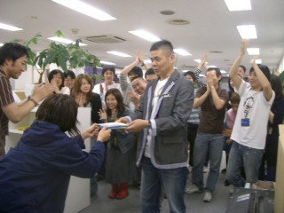 谷川俊太郎賞、続報 見事、栄えある 「谷川俊太郎賞」を受賞した『小さいことばを歌う場所』。 急遽こしらえた「受賞オビ」を巻いた本を著者、糸井重里に渡しました。 式典なき賞ですから、身内でせめてものセレモニー。 著者もたいへん喜んでおりました。 お祝いのメールをくださったみなさん、どうもありがとうございます! 『小さいことばを歌う場所』は現在、好評再販中です! まだの方は、ぜひ。 親しい人への贈り物にも最適です。 どうぞよろしくお願いします。 2007/05/27 15:02 |