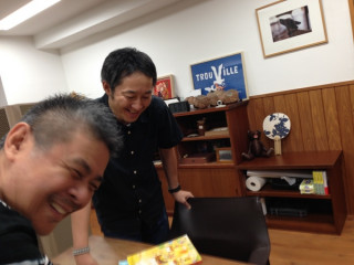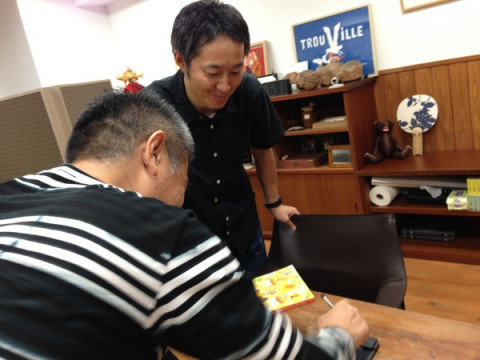 いいものじまん 社長室に行ったら 「いいもの」について話していました。 「こういうふうに、 メモみたいに書けるんだよ」 そりゃ、便利そうですね。 どない? と、試し書きをしてみたんですね。 「あ、待て! 写真に撮るなら、 もっといいものを書けるぞ」 わーい、書いてください。 絵ですか? わくわく。 (サラサラサラサラ、と書く) え? おにぎり頭に‥‥「南しんぼう」? 「人のサインじゃないですか」 「ごめんごめん、 じゃあ、もいっかい (サラサラサラサラ)」 それは、えーとみう‥‥らじゅん。 また人のサインじゃないですか。 なんでですか。 しかもみうらさん、こんなサインじゃないですよ。 * そして社長は、背を低くして、一日の予定を終え、帰っていきました。 おつかれさまです。 2013/10/10 19:39 |