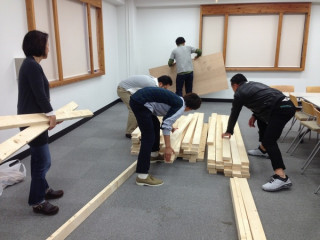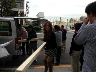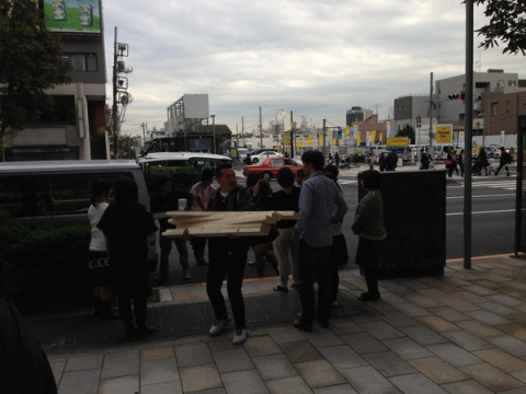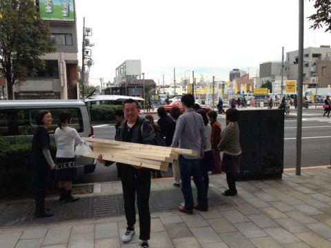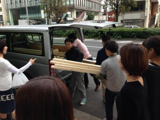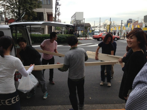 資材運び 「資材運びを手伝ってもらえませぬか」 という呼びかけのもとに、社内にいた多くの人がビルの外に出ました。 出たら、わー! なにごと! 道を通行中の方々も、 「え? なにごと?」 という目で見ています。 すみませんすみません、ちょっとすみません。 長いものは長さを考慮して、人に迷惑をかけないように、慎重に運びます。 わたしたちは、イベントのときのイス運びとか、機材運びとか、案外そういうこともするので、こういうのはみんなけっこう慣れています。 せっせと運びます。 そして、案外、キライじゃない。 こういうことをすると、筋肉ハイになりますよね。 もっと運ぶもの、ない? もっと運びたいんだけど! ‥‥あ、ないの。 そ‥‥。 みんなでやると、すぐに終わります。 あ、そうそうこれらの大量の資材はどうやら、今度の土曜日の 「ものが生まれる瞬間フェス」で使うものらしいです。 誰が、何に? たのしみですね。 2013/11/14 14:55 |