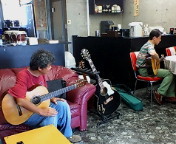フフフン♪ フフフン♪ 東京都内スタジオにて、乗組員ハリー(写真上の右)がギターの紳士と打ち合わせをしております。 その紳士は、発声練習をするでもなく、ギターの伴奏とともに軽快に歌い始めました。 その第一声の美しいことったら! 耳覚えのある軽快な音楽が開け放たれた窓から快晴の空へと流れていったのでした。 ああうっとり。 この紳士を、知っている人も、知らない人もどうぞお楽しみに。 (じれったくてごめんなさいね。 <永久紙ぶくろチームより>) 2007/06/15 19:11 |