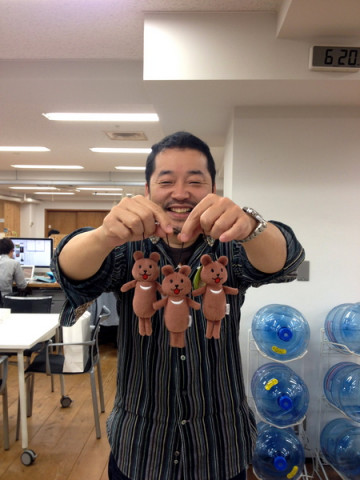 くまおがいっぱい! あら、 それは、「くまお」のマスコットではありませんか! 「どう? かわいいでしょー」 といいながら、ぬいぐるみを上下に揺らし、びよんびよんさせてアピールするべっかむ3さん。 顔がデレデレです。 このマスコットは、 「コップのふちこさん」で知られる奇譚クラブさんにつくっていただきました! 幾多のくまおを見てきた担当のべっかむ3さんをデレデレにさせるとは、さすがの完成度でございます。 明日の午前11時より、このマスコットがついた 『くまお はじまりの本』が先行販売になりますー。 くまおマスコットのセットは限定500セットですので、ご希望の方は、どうぞお早めに! 2013/11/20 19:24 |
