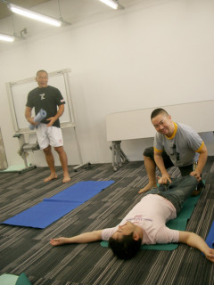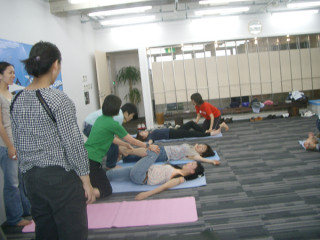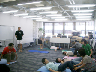 TK式体操とは、 きょうからはじまりました高阪TK剛の「みんなのカラダ」。 いずれは「TK式体操」というだれでもたのしくできる体操を完成させよう! という目標をもって、TKがいろんな人のところに話をききにいくというコンテンツです。 で、そのTK式体操、TKとしてもまだ模索中なわけですが、われわれ乗組員たちが週1回、TKの実験台として協力させていただいております。 寝そべってなんだか妙なことをしているこの写真は、 「股関節のストレッチ」です。 弊社はどうやらものすごくカラダの硬い人が多いみたいです‥‥。 2007/06/20 19:03 |