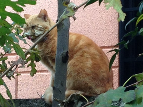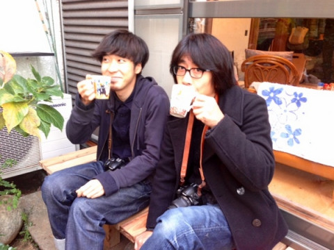 数匹のねこを眺めながら、プリグラフィックスのおふたりと縁側でコーヒー。