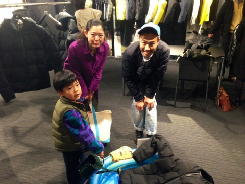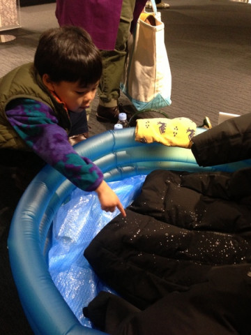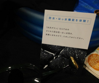 水沢ダウン祭りの会場にある、水沢ダウンの撥水のすごさを体験できるコーナーのプール。