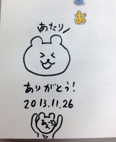 今日もあーちんは。 昨日、160冊の 『くまお はじまりの本』にサインをしてくれた、あーちん。 そして、昨日の事務所に来られていた、 和田誠さんとサイン本の交換をした、もっている、あーちん。 今日も、サインの続きを書きに、放課後、事務所に寄ってくれました。 今日も、カラフルなボーダーのくびまきで、おしゃれさんです。 昨日の和室から「スペース青山」に場所を移動して、イスに着くと、サインペンを片手に、早速スタート。 連投大丈夫かなあ、と見守っていると、サインもずいぶん慣れてきたみたいで、あっという間に、600冊目。 久しぶりの「あたり(キリ番)」は、くまおとねことうさぎの仲良しコンビのイラスト入りになりました。 絶好調のあーちんは、 「3日連続でも、手はぜんぜん 疲れてないよー」とそのあとも、どんどんサインをしてくれて、さっき、600冊目を書いたと思っていたら、もう、700冊に到達! まーくんを上回る3連投も、 「くまお」を読んでくれてるうれしい気持ちと、買ってもらった感謝の気持ちで書けるんだとか。 すばらしいよ、あーちん。 今日もランダムに、 「あたり」のくまおを描いたり、おしゃべりしたり、集中したり、放課後の部活?のように、たのしみながら、たくさんサインを書いてくれました。 その数、3日間でなんと、760冊! すごい!ほんと、おつかれさまでした。 これで、12月2日以降の、最初の出荷分のサインは終了。 残りのサインは、あらためてまた時間のあるときに、書いてもらう予定です。 すでに、お買い上げいただいたかた、もう少ししたら、「くまお」の本や、 「くまおマスコット」がやってきますよ。 もうしばらく、お待ちくださいね。 また、これからのギフトシーズン、だれかにあげたいな、というかたや、もちろん、自分が読んでみたいかたも、『くまお はじまりの本』は、 こちらのページで絶賛販売中です。 くまお情報やあーちん情報は、新着ニュースが入りしだい、また製作中でおしらせしますね。 最後は、あーちんとくまおたちで、カーテンコールのご挨拶です。 あーちん、サインおつかれさまでしたー! わー、わー、パチパチパチパチ、ブラボー! (スタンディング・オベーション!) 「『くまお』の本、よろしくー!」 2013/11/26 21:52 |