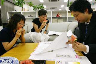 おびただしい付箋のついた戻しをスイカをほおばりながら説明する