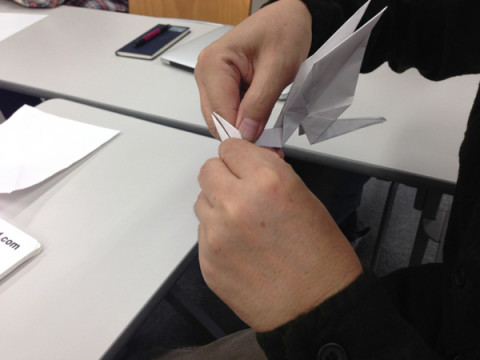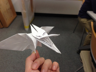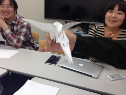 ラドン。 いま、 「気まぐれカメら」にあるように遠方にいるので、この写真は先週撮影されたものである。 つまり‥‥ 「それは先週のことじゃった。」 会議に なにか、こうおおきな方針をさらっとしゃべった後、お正月のコンテンツに、 「いいんじゃない?」と言い、そして、話は『空の大怪獣ラドン』の話になった。 ラドン温泉じゃなくて、空飛ぶ怪獣の話だそうですよ。 「オレ、ラドン作れる。 正方形の紙を2枚用意。 じゃ、リカス、 鶴の途中まで折って。」 そういってリカスに紙をわたします。 そして、鶴の途中までと鶴の途中までを合体させて、ラドン完成。 怪鳥音を口にしつつ、ラドンが会議を飛んだのでありました。 そのあとで、社長は、 スナック芸を各種披露してそして去って行きました。 「こういう芸を たくさん知ってたからといって、 モテるわけではないから注意だぞ。 せいぜいその場で わ〜〜!っていわれて、 やんややんやと囃されて終わり。」 2013/12/02 15:51 |