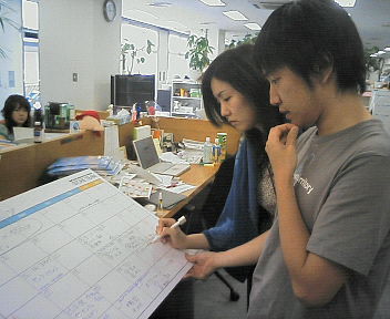 おっきいボードをもって おっきいボードをもって、難しい顔をしているストアチームの どうしたの?何があったの? 「7月にはたくさんのほぼ日グッズや書籍が販売になるので、その調整をしているんです」 おお。 それは巨大なホワイトボードカレンダーなのですね。 (ちなみにデザイナー Tシャツやタオルなどのグッズだけでなく 「TVウォッチャーの逆襲」や 「谷川俊太郎質問箱」もほぼ日ストアで買えるようになりますからね。 ちゃくちゃくと「谷川俊太郎質問箱」の出版準備を進めている の所へも聞き込み調査がはいります。 「で、いつごろ発売なんですか?」 「この日にお知らせして・・・」 「はい」 「この週には、出荷できたら・・・」 「う〜ん・・・。」 「どうかな?」 「・・他のチームとも調整してみますね」 どうやら来月7月は、かなり盛りだくさんな商品展開になりそうです! 「谷川俊太郎質問箱」の発売日も近日発表いたします。 ご期待ください〜! 2007/06/28 12:19 |