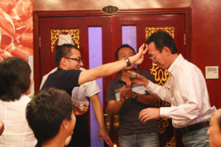 あいてのおでこに「白酒」をちょびっと付けあい、そのあと、互いに乾杯しあうのがモンゴルのしきたりのようでした。
