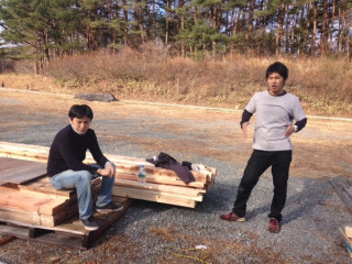 寒かったり、暑かったり。 昨日に引き続き、気仙沼にツリーハウスのお手伝いにきています。 今日は別の用事もあり、お昼までしか手伝えないので、朝イチからいっぱい働くつもりでやってきました。 足もとには霜がおりてますが寒さにめげずみんなで元気に朝礼! 持ち場にわかれて、体を動かしはじめると日が昇ってきたこともありポカポカしてきます。 ご覧ください。 ニシダとじゅんぺーの薄着っぷり。 「汗かいたぁー! これだけ体を動かしていたら痩せちゃいますかね?!」 「ご飯をおいしく食べちゃうからむしろ太っちゃうんじゃない?」 「まじっすか!どうしよう」 一日手伝っただけでどこまで心配してるんでしょう。 ツリーハウス作り、楽しく、いい運動にもなっているのは確かです。 2013/12/05 11:44 |