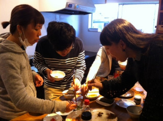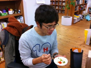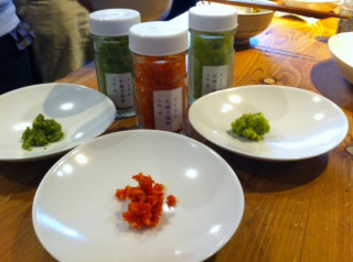 試食しましたー。 連載第6回を迎えた 『フミ子さんのゆず胡椒』、本日ついにゆず胡椒が完成しましたね! 原田家のみなさんが一生懸命に作った 「ゆず胡椒」はほんの少量ではありますが明日から吉祥寺のカフェと串焼き屋さんで販売開始いたします。 昨夜、原田トモヒロさんがほぼ日に寄ってくださって一足早く試食用の「ゆず胡椒」をくださいましたよ! さあさあ。 キッチンでごはんと焼き魚をほおばる乗組員たちに試食をしてもらいましょう。 青・黄・赤の三色「ゆず胡椒」ですよー。 と大好評。 どれも鮮烈なからさなので、食べる量を加減しないと のような顔になりますが (ふたりは、スプーンに半分くらいがっと口にいれてしまいました) 本当に爽やかでおいしかったー!! 明日11:30からカフェ・アマルさん 17:30から天壺さん で販売開始です。 (冷凍のままお分けするので、保冷バッグを持って行くといいとお思います) 自分で作ってみたい、というかたは レシピのダウンロードもできますのでぜひどうぞー。 これからの季節だと黄色柚子で作れそうですね。 2013/12/06 18:00 |