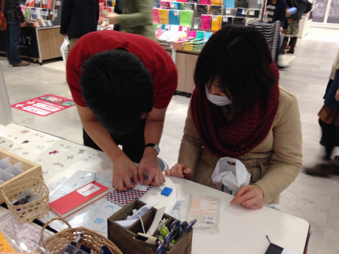 1席のみのVIPシート! 関西人はキラキラが大好き! お子さんからマダムまでたくさんのお客さんが 「なんやの?なんやの?」 と、立ち止まってはテンプレートシールと手帳を手にとっていかれます。 なんと、売り場スペースをやりくりして工作スペースができました! 1席のみのVIPシートですが、道具もすべて用意しているのでここでラインストーンカスタマイズもできちゃいます。 そして、こちらの方は横浜でのワークショップに参加された方。 「続きがやりたくて。」 と、テンプレートシールをこられたのだとか。 キラキラあついですねえ。 2013/12/14 14:24 |