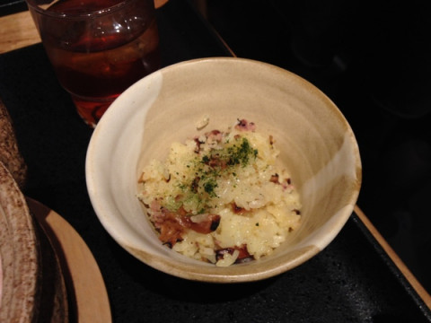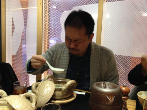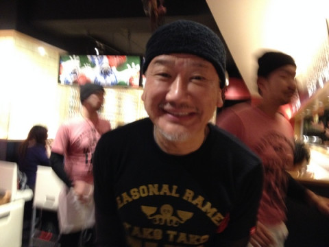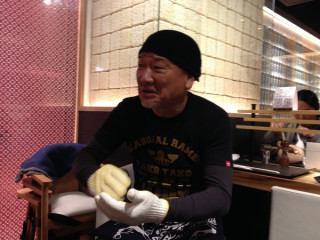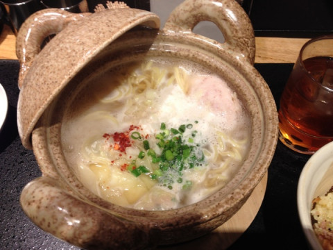 蛸土鍋ラーメン 店内に案内されて数分で、出てきました、出てきました! 蛸土鍋ラーメン!! スープがグツグツしているのが、わかりますでしょうか?? 干した蛸でスープをとったこの出汁、最初に蛸の風味がふわっとくるのですが、くせがなく、あっさりとしていました。 スープを一口のんだ 麺にはサフランが練り込まれていて、スベスベ、もちもちとした食感。 蛸めしにもサフランが入っていて、これがまたおいしかったー。 もちろん、一風堂の店主である 河原さんもいらっしゃいました! 蛸出汁って聞いたことがなかったのですが、どうやって思いつかれたのでしょう? 「ものすごくおいしい蛸めしに出会ってね。 だったら、蛸から出汁をとったら、 ぜったいにおいしいスープが できると思って。 やってみたら、思ってた以上に 上品なスープができたんだよ。 途中まで食べたら、胡椒をいれて、 味をかえて食べてみてくださいね。 胡椒をガリガリとやって、 入れてみてねー」 とあつく語ってくれました。 ふー、おなかいっぱいです! 帰り際も、河原さんは笑顔で送り出してくれました。 ありがとうございました! 四季のラーメン「蛸土鍋ラーメン」は本日、銀座店でのみ食べられます! なくなりしだい終了なので、どうぞ、お早めにー。 2013/12/18 15:40 |