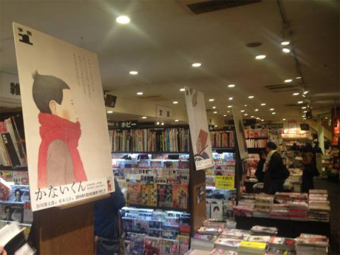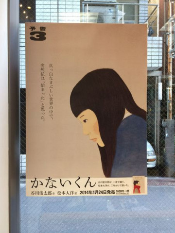 『かないくん』ポスター 以前お知らせした、『かないくん』の松本大洋さんイラストポスターですが、本日からカウントダウンの最後、第三弾が一部の書店でご覧いただけます。 前回ご紹介しきれなかった 渋谷TSUTAYAさん、 ジュンク堂書店池袋本店さんの3種類がそろった様子をご紹介しますね。 応援してくださって、本当にありがとうございます。 さらに、先日渋谷にオープンした LOFT&さんに (写真で言うと5枚目と6枚目です) 貼り終わるとさっそく、携帯で撮影するお客様がチラホラ。 3枚がそろうと、なんというか、静かにせまってくる迫力を感じます。 そして、本日連載がはじまった対談と、 ご紹介の動画では、著者である谷川さんと松本さんをはじめとして、携わってきた方たち一人ひとりが、どんなきもちで『かないくん』と向き合って来たかをかいま見ることができます。 ぜひ一度、ご覧になってみてください。 完成までたっぷり時間をかけてつくった絵本『かないくん』は、いよいよ今週末1/24(金)から、ほぼ日ストアと、全国の「ほぼ日ブックス」取扱い書店、ロフトで一斉に発売開始となります。 ほぼ日ストアでお買い上げいただくと、限定特典として谷川俊太郎さんのメッセージや、松本大洋さんのラフスケッチを収録した「かないくん 副読本」 (非売品)がつきます。 どうぞ、おたのしみに。 2014/01/20 19:01 |