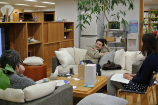 テレビ前のソファー席で3人が3時間くらいずーーーっと話し合いをしています。