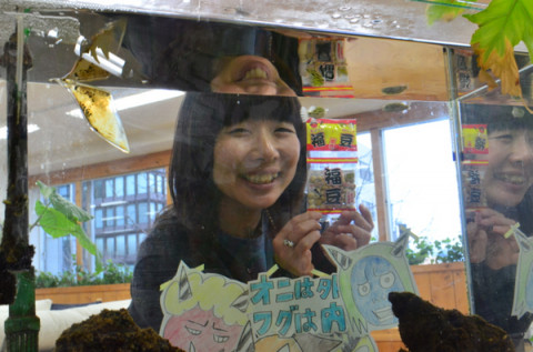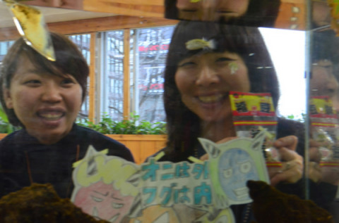 知られざる慣習。 本日は節分なり。 本日は節分なり。 じつは、「ほぼ日」の フグカメラには、節分の日には鬼が現れます。 ご存知でしたか? この鬼ら、もうずいぶんまえから2月3日には必ず現れています。 イラストレーテットバイ 記念撮影をしていたら、新人デザイナーの杉本さんが通りかかったので、一緒にはいってもらいました。 ようこそ。 ようこそ。 みなさんも、福豆を買って歳の分だけたべてハラをふくらませたり、鬼に豆をぶつけたりしてやりましょうぞ。 ついでに、福豆の小袋にはわたくしの年齢の個数の豆が入っていなかったことをここにご報告しておきます。 がくーっ! 2014/02/03 17:17 |