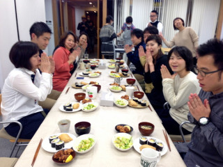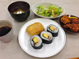 ふとまきずし、おいなりさん、からあげ、しょうがのサラダ、麸のお吸いものです。