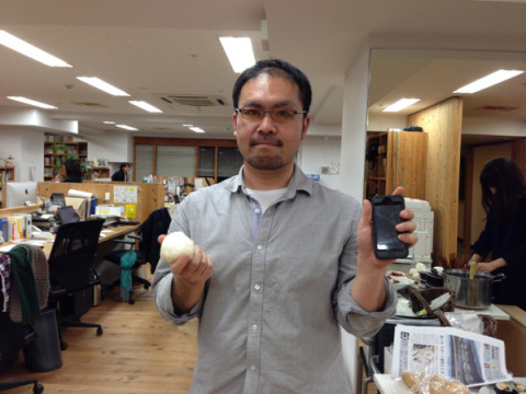 とおもって振り返ったら、おにぎりとiPhoneをもった