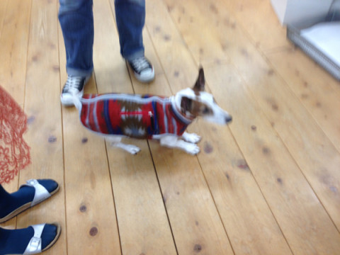 おもろな服イーン。 ねえねえ、 それもしかして、くっついてる? セータがセータにくっついてる? 「もぎちゃーん、 さいきんどうよー」 とかいうおじさんのセーターの状態でくっついてるわけ? そういう服、どこでみつけてくるの? という話をしていたところで爆笑している 前からみれば普通だけど、後ろにチャックがついてる。 セーター、スカート、そしてスカートのひらひらまで貫くチャック‥‥。 これはあれだ! チャックあけると誰か出てくるだろう! 「背中にチャックならば、 今日のブイヨンの服と おそろいだね。」 そうだね! 2014/02/04 20:51 |