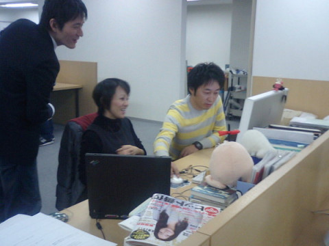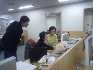 けんかしなっ。 と、いうようなトムとジェリーの主題歌が、わたしの耳に聞こえてくる気がいたします。 あそこに見えるのは 「さっきのメール、意味がわからん!」 『なんでやねん!』 「わからなすぎて、席まで来てやった。」 『なんでやねん!』 どちらがどちらのセリフなのかは読者のみなさまの想像におまかせいたしますけれどもふたりをとりまく雰囲気があきらかにおもしろくなっているのは間違いありません。 ほら、やまかわみっちゃんまでウケてますよ? 仕事納め前に、こんな光景が見られて、よかったでーす。 2007/12/27 19:18 |