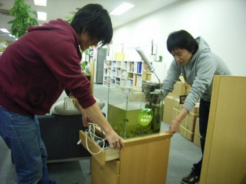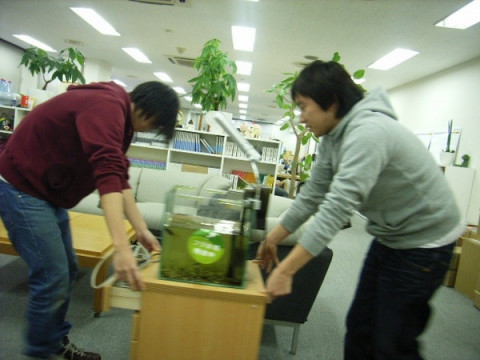 よいせ、こらせ、 お正月バージョンのトリプル・フグカメラも終了したので、今日から彼らもいつもの定位置に着くようですよ。 これで今日の社長の呼びかけにも 「着いたとも〜っ!」ってテレフォンショッキングばりにお返事できますね。 とかなんとか写真を撮らせてもらってると、わーっ、後ろ!後ろ! テーブルにぶつかりますよ! 気をつけて〜!! ああ、危なかったー。 なんとか災難は逃れたもよう。 では、先輩方に続いてわたくしも。 ことしもよろしくお願いいたします。 2008/01/07 14:04 |