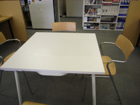 透明シート登場 さて、こちら、 「中央劇場」のテーブルでございます。 こちらは、新メニューのシャッフルの現場でございます。 本日、こちらに一つ道具が導入されました。 透明で大変わかりにくうございますが、こちらに、すべらないシート、通称“スベラーズ”が登場しました。 コンテンツの名前を記した紙片を拾い上げるときに、このシートがありますと、大変拾いやすくなるのです。 どうでもいいですか? そんなこと。 そうですか? じゃあ、本日のシャッフルの模様を次にご覧ください。 2008/01/15 12:20 |