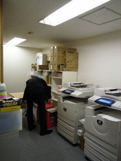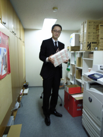 オッティ! コピールームでごそごそとしているのは、弊社の経理将軍の お酒が飲めないので、毎夜、晩酌ならぬ晩菓子をしている お好みの銘柄は、「キャベツ太郎」と 「うまい棒」である。 それはさておき、今日はどうやら、大切な会議があるらしく、びしっと戦闘服着用である。 会議では何事かを資料を駆使して説明をせねば成らないらしく、あがり症の将軍は、資料をコピーするためのA4の用紙を手に、いまから不安を隠せないのである。 会議に出席している人はじゃがいもであるし、手のひらに「人」という字を書いて飲み込めばいいんじゃないか? ベタなアドバイスをもって、応援と代えさせていただきます。 2008/01/17 11:50 |