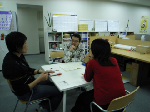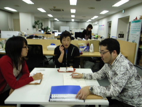 今日は、いろんなチームが、島と島の間にある妙なスペースに置かれたテーブルで会議を開催。