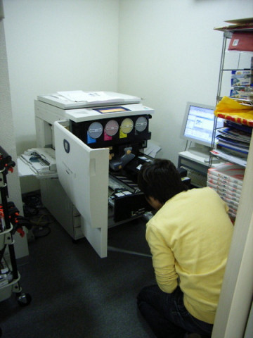 プリンターの危機。 コピーを取りに作業部屋に来てみたら、プリンターの内部がむき出し状態。 む、事件のにおいがします。 機械と格闘中の田口さんいわく、中で紙が引っかかってプリントが出来なくなってしまったとのこと。 ええ〜!それって地味に大変なことじゃないですか! わたくしメカ音痴なもので、何にもお手伝いはできませんが、力の限り見守らせていただきます。 フレー!フレー! タっグっチっ!(さんっ!) がんばれ!がんばれ! タっグっチっ!(さん!) おおーっ!! いやったーっ! どうぞ見てください、このやり遂げた男の顔を。 いやー助かりました! ありがとうございます、田口さん! 2008/01/29 16:43 |