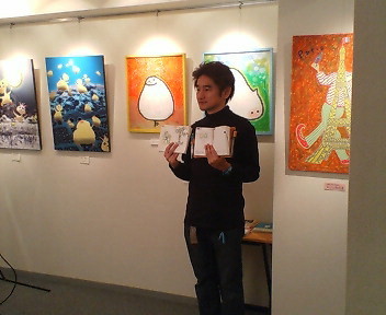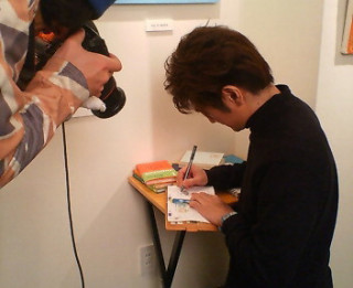 グループ展開催中です。 今日は、ブタフィーヌさんの作者、 たかしまてつを先生の 「ほぼ日手帳」の取材で、ちょうど開催中の、先生のグループ展の会場におじゃましてきました。 先生のほぼ日手帳は、見ていて楽しくなるイラストがたくさん! 食い入るように見ていると、 「実際に描いてみましょうか?」 と、さらさらさら〜とカメラマンさんの靴を描いてくださいました。 そうやって、気に入ったものを見つけると、スケッチしてページに書きとめていくんだそうです。 その様子は、あらためて 手帳CLUBでご紹介しますので、どうぞお楽しみに〜! そして、グループ展は、2月11日(月)まで開催されていますので、もし良かったらのぞいてみてくださいね。 「expression design」展■会期2008.2.6(水)-11(月) 11:00-19:00(最終日は17:30まで) ■会場 ミレージャギャラリー 2008/02/07 19:00 |